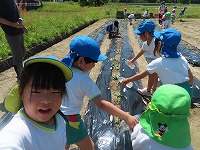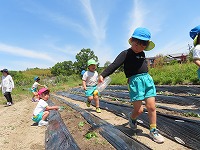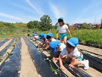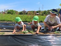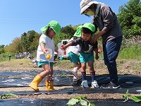 しっかり手で土を掘って、苗を横に寝かせて土を優しくかぶせました。新たな発見が!「思い出した!サツマイモはこんな葉っぱを植えて大きくなって、お芋になるんやな。里芋はこの前、お芋を植えたのに、違うね。」と話してくれました。先日、里芋も植えたので違いを感じ取ってくれたようです。経験が知識となっていくことが私たちも嬉しいです。