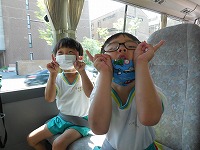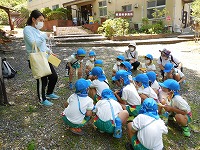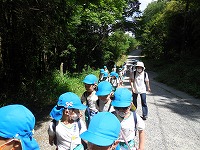 気持ちの良い天気に恵まれ、お母さんや3,4歳児に見送られて、5歳児がバスに乗って野外保育に行きました。バスの中では、今から行く山の家に期待をして元気いっぱいの子ども達。山の家までの道のりも友達と楽しく話しながら歩くことができました。