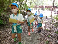 入所式の後は、山の探検に行きました。少し山の中はひんやりしていて、「この道はどこにつながっているんかな」と、探検気分を味わいながらカードを持って歩きました。