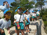 途中、景色が広がって遠くまで見渡せる場所に到着。子ども達は、おもわず「ヤッホー」と呼びかけていました。「何が見える?」「幼稚園見えるかな?」と、見晴らしの良い景色を眺めて楽しみました。