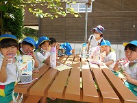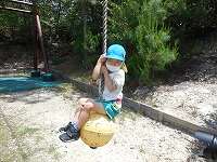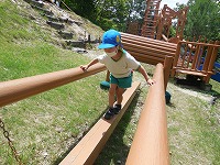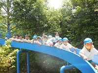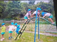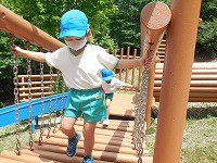 探検の後は、ジュースを飲んでほっと一息つき、子ども達が楽しみにしていたアスレチックで遊びました。ゆらゆら橋やターザンロープなど、いろいろな遊具に挑戦しました。最後は、「すみれ組列車出発!」と、連なって滑り台をを滑り「楽しかったな」と満足そうな子ども達でした。