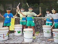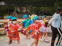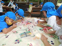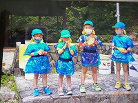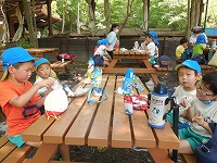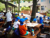 たくさん遊んだ子ども達は「おなかすいたー」と、おなかがペコペコ。涼しい木陰でおにぎりやおやつを食べ、ゆっくりと過ごしました。食後は、山の家にいった記念に、思い思いの絵を描いてキーホルダーをつくり、早速かばんにつけて嬉しそうでした。最後は、自分たちで考えたダンスや太鼓をを、みんなの前で発表し、たくさんの拍手をもらって嬉しそうでした。