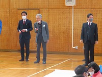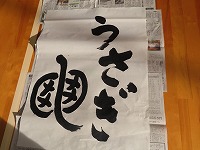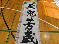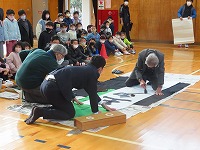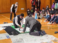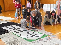 地域の書道家 辻尾仁郎先生が来てくださり、大きな大きな紙に大きな筆でうさぎ年にちなんで「玉兎芳歳」を書いて見せていただきました。思わず拍手する子ども達でした。
