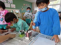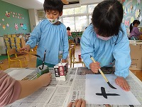 興味をもった子ども達は早速、幼稚園に戻って「書き初めごっこ」をしました。「お兄ちゃん・お姉ちゃんみたい!」と嬉しそうに書きました。