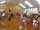 ホールで体操をし、玉入れの玉を体に乗せてバランスを取ってみたり、