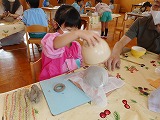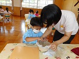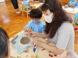 7月21日 年長すみれ組は古賀先生に来ていただき、きらら体験で陶芸教室をしました。初めての経験にワクワク・ドキドキ♡先生の話を真剣に聞いていました。一つ一つの工程を丁寧に教えていただき、だんだん形になっていく姿に「わー!」「すごい!」と歓声をあげていた子どもたちです。