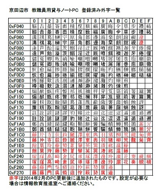 赤字で記載されている文字は、2014年2月の貸与ノートPC更新以降に追加された外字ですが、実際に利用していただくには、貸与ノートPCごとの個別設定が必要です。