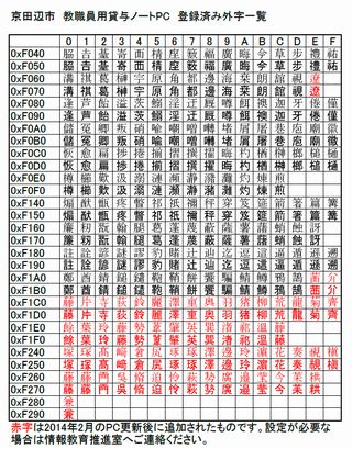 赤字で記載されている文字は、2014年2月の貸与ノートPC更新以降に追加された外字ですが、実際に利用していただくには、貸与ノートPCごとの個別設定が必要です。