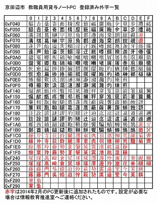 赤字で記載されている文字は、2014年2月の貸与ノートPC更新以降に追加された外字ですが、実際に利用していただくには、貸与ノートPCごとの個別設定が必要です。