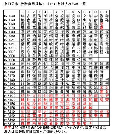 赤字で記載されている文字は、2014年2月の貸与ノートPC更新以降に追加された外字ですが、実際に利用していただくには、貸与ノートPCごとの個別設定が必要です。