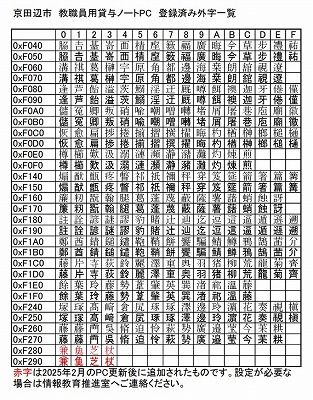 赤字で記載されている文字は、2025年2月の貸与ノートPC更新以降に追加された外字ですが、実際に利用していただくには、貸与ノートPCごとの個別設定が必要です。