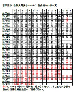 貸与ノートPCの外字更新についてお知らせします。貸与ノートPCには、下記一覧表に黒字で記載されている文字を外字として登録済みです。赤字で記載されている文字は、2014年2月の貸与ノートPC更新以降に追加された外字ですが、実際に利用していただくには、貸与ノートPCごとの個別設定が必要です。赤字で表示されている外字が必要な場合や、一覧表に無い外字が必要な場合は、情報教育推進室へご相談ください。尚、外字は「明朝体に似せたもの」と「ゴシック体に似せたもの」の2種類を登録しておりますので、必要に応じて使い分けをお願いします。