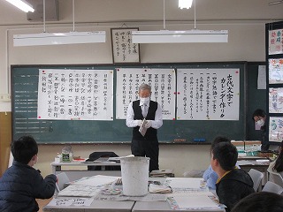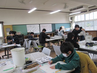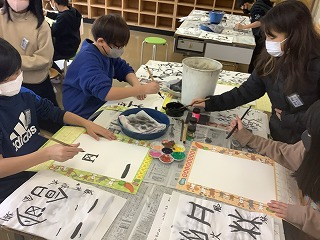 今日29日と明日30日は地域で習字を教えておられる小林先生にお越しいただき、3年生から6年生まで、古代文字体験学習を行いました。一人一人考えて決めていた四字熟語を小林先生が古代文字に変換してくださり、それを今年のカレンダーに書くといったものです。ある子は「一期一会」ある子は「一石二鳥」ある子は「一生懸命」などなど・・・・各々に考えてきていました。古代文字になると、読めないほど難しい字になるのですが、それぞれが芸術的に仕上がり、世界に一つだけのカレンダーが仕上がりました。