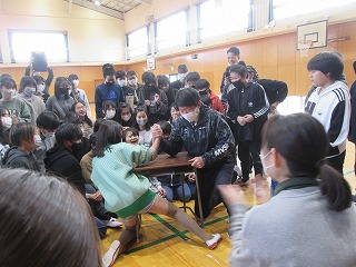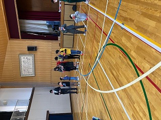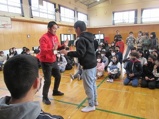 順番にお世話になった先生方について6年生の代表者がエピソードなどを交えて紹介をしてくれ、その先生方とバスケットのフリースロー対決、縄跳び対決、腕相撲対決、最後にみんなでドッジボールをしました。そして、最後に素敵なカードをいただきました。