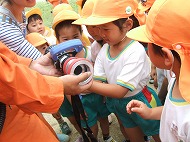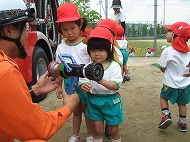 「ここからお水でるの?」 「これは、何をするの?」など、いろいろ質問をして消防士さんに