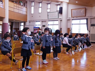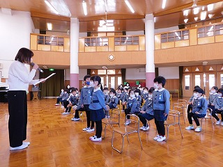 始業式では3学年がホールに集まり、担任の先生から名前を呼んでもらったり、冬休みはどんなふうに過ごしたのかなどの話を聞きました。