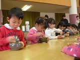 「ばら組さんじょうずやなぁ」「おいしいなぁ」と言いながら、4歳児の子ども達は、大きい組さんが点ててくれたお茶をじょうずにいただきました。「ばら組になったら、できるんやで」と進級が楽しみの4歳児の子ども達です。
