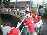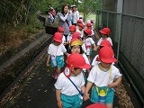 友達や先生と一緒に「えんそく!えんそく!」と、水筒を掛けて、咋岡神社の周辺を散策しました。「かめさんいるかなぁ」「あそこに、かたつむり!」「こっちにも」「かたつむりも、えんそくかなぁ」木のトンネルをくぐり、川の横を歩き、友達の後ろを並んで歩いて、一回りすると「幼稚園がみえた!」 楽しい気分のえんそくでした。「また、えんそくいこうね」「今度はどこにいこうかなぁ」