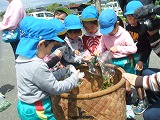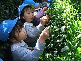 「わぁ!いっぱい!」「なんか、みどりのにおいがするわ」と、お茶畑のみどりのトンネルに入った子どもたち。摘み方を教えていただき「きみどりのはっぱ」「やわらかいはっぱ」「これかなぁ」「これつもう」と、お茶摘みを楽しみました。