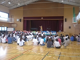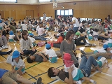 歌ったり、リズム遊びをしたり、楽しい歌と動きに子ども達のすてきな笑顔と元気な声が、小学校の体育館に響きました。あっという間に時間が過ぎて、子どもたちの『アンコール』も飛び出しました。最後に、お家の人と“ごぼうさん”のふれあい遊びを一緒に楽しみました。もっともっとお家の人と遊びたいひとときでした。