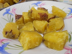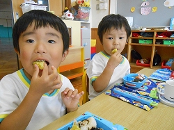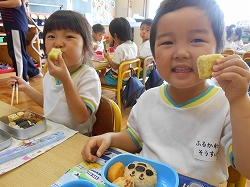 早速、蒸かし芋にしていただきました。「甘いね。おいしいね」「おかわり!」とうれしい声が響いていました。今度はもみ殻で焼き芋をして頂く予定です