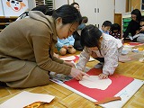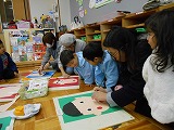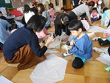5歳児は3枚の折り紙で作るコマ。4歳児はカラーポリと竹ひごで作る凧。3歳児は画用紙で福笑いを作りました。「こうしたらどう?」「そうそう上手ね」と親子で遊ぶ楽しさを感じながら素敵な時間となりました。幼児期における親子で遊ぶ大切さを感じることができました。