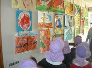 「この本貸してください」「ありがとう」          展示されていた絵も皆で見ました
