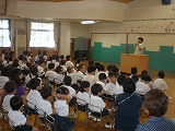始業式で、一人一人名前を呼ばれて元気よく返事をしたり、歌をうたったり。 二学期も、「元気に“おはようございます”って挨拶して来ようね」「いっぱい使ってあそぼうね」 などお話を聞きました。