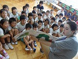今日は、ALTの先生をお招きしました。一緒に遊んだり、英語で挨拶したり、「はらぺこあおむし」の英語版の絵本を読んでいただきました。