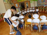 八幡高校のお兄さん、お姉さんも交流授業で幼稚園に・・・。お兄さん、お姉さんとの触れ合いも楽しんでいた子どもたち。