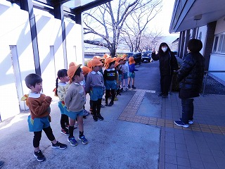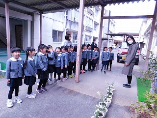 10月に人権擁護委員の皆さんと一緒に植えた水仙の球根が、立派に花開きました。その水仙を4歳児は地域にある老人福祉センターの常磐苑に届けました。お花のお世話を通して、生き物や植物を大切にするきっかけのひとつになりました。「ありがとうございます」と職員の方や利用者の方に声をかけていただき、子どもたちも嬉しかったそうです。命を大切にの気持ちを地域の方にもつなぐことができました。