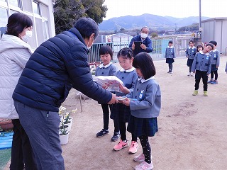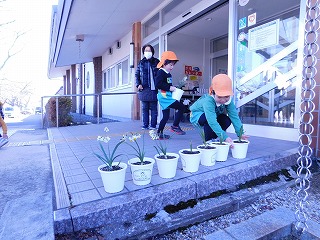 5歳児は幼稚園の隣にある小学校へ届けました。小学校の校長先生に出迎えていただき、水仙の花を届けることができました。4月からは1年生。水仙の花たちも、子どもたちを見守ってくれることと思います。