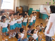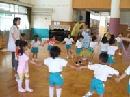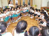 江戸時代以前より歌い継がれてきている「わらべうた」は、日本語のもつ響き、言葉の味わいを子どもたちに伝えることのできる優れた伝承文化で、心地よいリズム、情緒を安定させる抑揚が、安心感を与え、想像性を豊かに引き出してくれます。 ♪「ほー、ほー、ほーたるこい」 ♪「いしまつ、たいまつ~♪」 「小さい組さんにも教えてあげよう!」 ♪「あめだ あめだ かえるが ないている~♪」