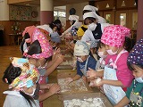 おやつにはきな粉もち、「やわらかい」「おいしいなぁ」「おかわり!」大喜び。お昼は、すまし雑煮をいただきました。「おもちが、のびる!」「お餅のおかわりください!」「お汁のおかわりも!」4,5歳児がついて、みんなで丸めたお餅。3歳児のこども達は、初めての経験でフワフワ・モチモチの感触に大喜びでした。