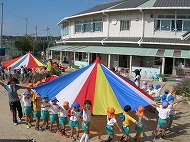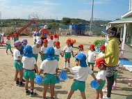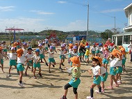 子どもたちは、園庭で運動会ごっこを楽しんでいます。5歳児のリズム表現♫「キッズソーラン」を、3・4歳児も一緒になって踊っています。