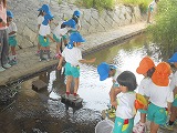 食後は、網を持って近くの川へ・・・。「ザリガニみーつけた!!」「こっちにもいる!!」と、大騒ぎ・・・。