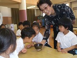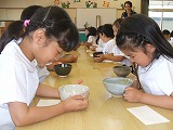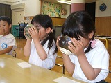 4歳児だった2月に、大きい組のばら組さんにお茶を点ててもらい『ばら組さんになったら・・・』と、心待ちにしていました。お茶の先生から、お茶のお話を聞き、お点前を見る目も興味津々の表情でした。お菓子やお茶のいただき方を教えていただき、「おさきにちょうだいします」と、真剣なそして、嬉しい表情の子ども達でした。