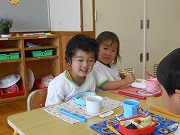 今日は、3歳児さん、初めてのお弁当。「おいしいな」「たまご大好き!」「おいしいな~」と・・・。お母さんの心のこもったお弁当を、笑顔いっぱいで食べていました。