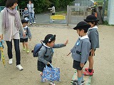 5歳児ばら組、すみれ組の子どもたちが、朝門のところで「おはようたい」をしています。登園してきた子どもたちは、嬉しそうにタッチをしたり、ちょっと恥ずかしそうに「おはよう・・・」と、言ったり。「おはよう」の、挨拶はすてきな言葉。楽しい一日の始まりです。