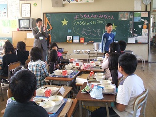 給食を配膳してもらって「いただきます」 いつもは、賑やかな子ども達も今日は緊張で、ちょっとちがった姿。