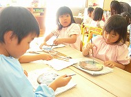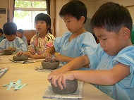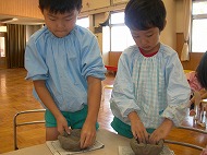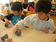 土粘土の感触を楽しみながら、3歳児は、おだんご、ドーナツ、たこ焼きなど好きな物を作りました。4歳児は、丸めて伸ばして陶板を作り絵を描きました。