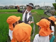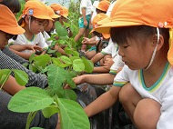 ポットに植えた枝豆の種が芽を出し大きくなってきたので、4歳児の子どもたちが畑に植え換えに行きました。「大きくなりますように・・・」「枝豆大好き!」・・・。収穫を楽しみにしながら、水やりをしました。そして、帰り道で、田んぼの中に小さなカメを発見!!「かわいいね」「幼稚園につれて帰ろう」「何食べるのかな?」・・・。今日も、りす組に、かわいい小動物が仲間入りしました。