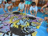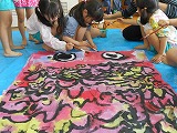 「♪やねよりたかいこいのぼり~」 5歳児の子どもたちみんなで大きな布にうろこを描き、絵の具で色づけをしました。とても生き生きとした、鯉のぼりができました。