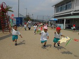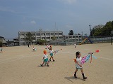 3・4歳児の子どもたちは、お家の方と一緒に鯉のぼりを作りました。早速、お隣の小学校の運動場で矢車に付けた鯉のぼりを風になびかせて遊びました。