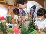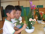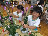 お花の先生から、いける順番を教えていただきながら、お花を1本1本丁寧に剣山にさしていきました。「お花にも前があるんやって」「これでいいかなぁ」「もうちょっと 切ってみよう」「かわいくなったわぁ」「押しすぎたら、折れてしまう」初めてのいけばなでしたが、とっても満足した子ども達でした。