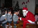 <サンタさんがやってきた> みんなが楽しみにしていたクリスマス会 学年毎に歌ったり楽器を演奏したり、お母さん達からも素敵な歌やハンドベルそして手作り楽器の演奏を聴かせていただきました。素敵な音色に感動しました。 ホールが暗くなり鈴の音と共にサンタさんが登場! サンタ語を話すサンタさんのお話しを聞いたり、質問したり、最後に一人一人プレゼントを頂きました。 お部屋に戻って、美味しいケーキを頂き、楽しい一日でした。