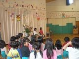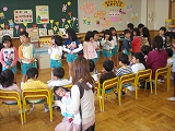 入園して間もない3歳児、なかなか集まって来ない子ども達も、「いっっしょにあそぼうね」「なかないでね」と言葉をかけてもらったり、歌や、ペンダントのプレゼントに大喜びでした。