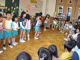 4月から新しく草内幼稚園に転入した5歳児、入園した4歳児、2人の歓迎会を、4,5歳児の子ども達がホールでしました。