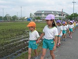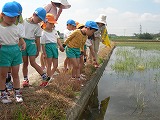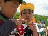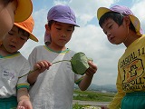 幼稚園の周りには自然がいっぱいです。これからも、四季折々の自然を見つけに、園外に出かけて行こうと計画しています。 年中組と年長組が手を繋いで出発! 「テントウムシの抜け殻だよ」 「こっちは幼虫だよ」 「ザリガニいるかな?」