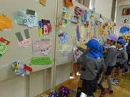 「ぼくの絵、あった!!」「これ、○○ちゃんの絵」「これは、○○」と、自分の絵を見つけたり、他の幼稚園のお友だちの絵を楽しんで見たりしました。
